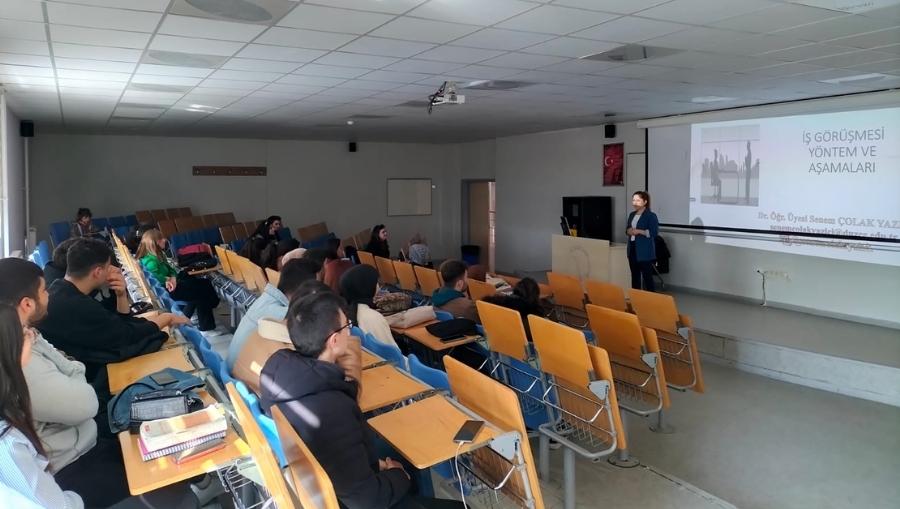 İş görüşmelerinin, adayların becerilerini, deneyimlerini ve belirli bir pozisyona uygunluklarını sergiledikleri işe alım sürecinin bir parçası olduğunu söyleyen Dr. Öğr. Üyesi Senem Çolak Yazıcı, özgeçmiş, ön yazı, yetenekler, nitelikler, kişisel özellikler, ilk izlenim ve vücut dili gibi iş görüşmelerinde yer alan anahtar kelimelere değindi.