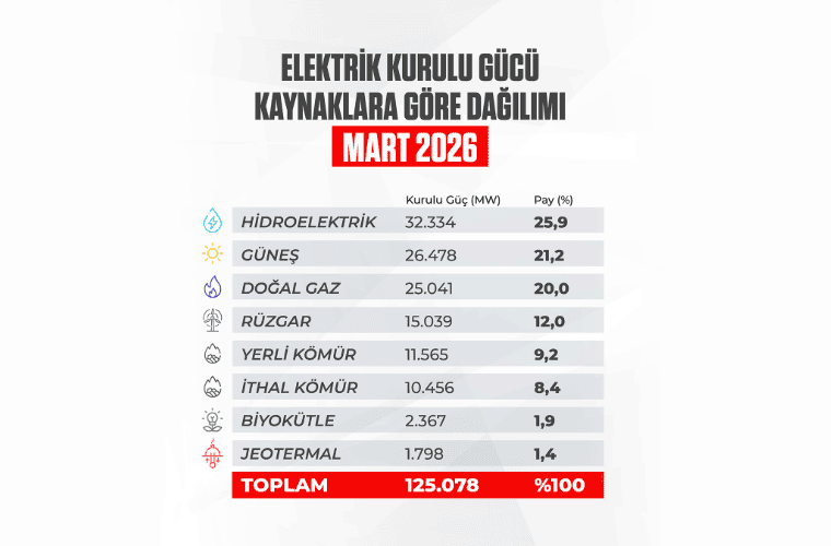 Mart 2026 Sonu İtibarıyla Türkiye’nin Elektrik Kurulu Gücü 125 Bin 78 MW’a Ulaştı