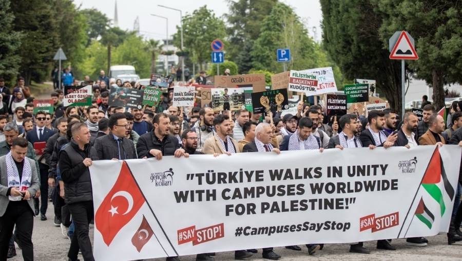 SAKARYA- Esentepe Kampüsü’ndeki kafe önünde toplanan Üniversiteli Akil Gençlik Öğrenci Topluluğu (ÜNİAK) üyeleri, Filistin bayrakları ve “İsrail savaş suçlusudur”, “Özgür Filistin”, “Filistin’de katliam var” yazılı dövizlerle Gazze’ye destek için Hukuk Fakültesi önüne kadar yürüdü.